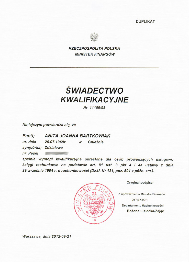 Posiadam świadectwo kwalifikacyjne nr 11109/98 przyznane przez Ministra Finansów potwierdzające spełnienie wymogów kwalifikacyjnych dla osób prowadzących usługowo księgi rachunkowe.
